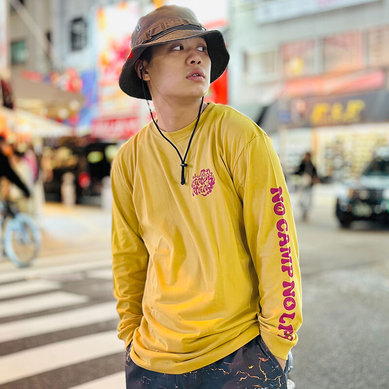 知る人ぞ知るCAMPMANである団長NG HEADがデザインしたグラフィックスをバックにオンしたロンTee。スモーキーグリーンのボディに、こだわりのプリントカラーでキャンプはもちろん、アウトドアシーンで大活躍する一枚。フロントにはスモーキーなロゴ、左袖には『NO CAMP NO LIFE』のメッセージが!毛羽立ちが少なくなるように工夫した糸を使用した5.6オンスの生地を使用したスタンダードな一枚。少しオーバーサイズでアウターに、レイヤード(重ね着)でインナーにするのも最適なユニセックスでおすすめの万能アイテム。