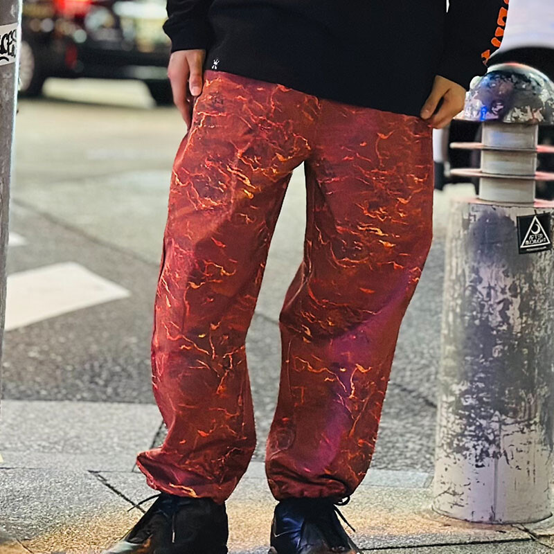 マグマ柄を全面にプリントした存在感抜群のイージーパンツ。
