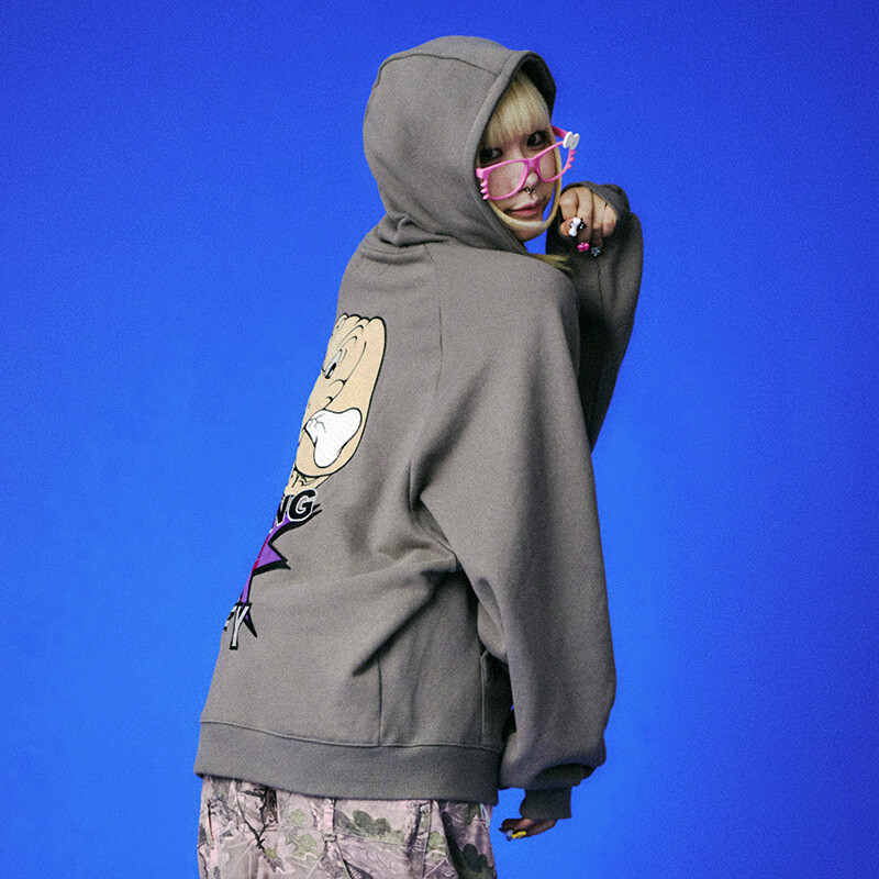 バックにおなじみワンちゃんを大きくデザインしたジップパーカ。フロントにも意味深なGOサインを刺繍しました。白の刺繍糸は蓄光素材で、暗闇で怪しく光ります。ドロップショルダーのラグランスリーブに身幅とアームホールを広く取ったビッグシルエットが特徴的な一枚。さらりとした風合いの裏パイル素材を使用したリラックスして着用いただけます。女性にもおすすめのユニセックスアイテムになります。