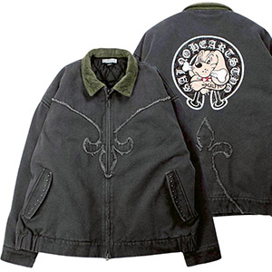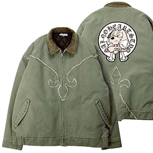 ヘビーウェイトのキャンバス生地にウォッシュ加工を施したユーズド感あるヴィンテージな雰囲気が魅力のカバーオール。フロント、バックに百合の紋章を施した存在感ある仕上がり。バックにはおなじみのワンちゃんをデザインしました。フロントポケットのフラップ部分には丸形スタッズをあしらったハードな雰囲気が魅力。中綿キルティング仕様でロングシーズン大活躍するアイテム。同じ百合の紋章をデザインしたアイテムとのコーディネートもオススメです。