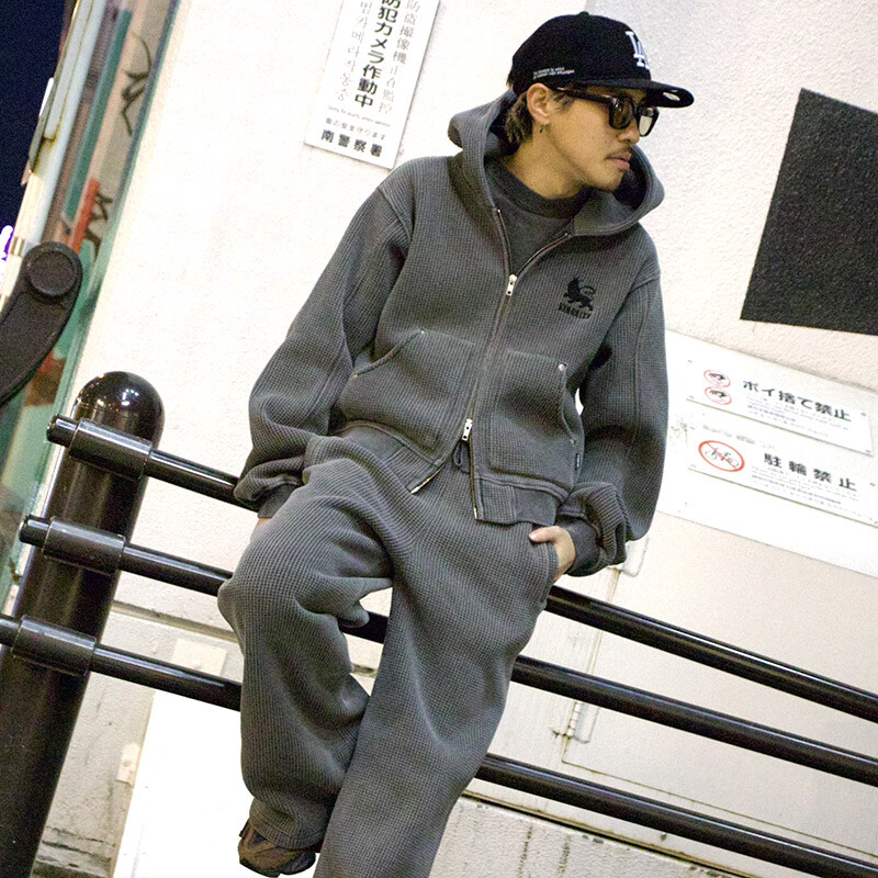 綿100%のワッフル生地とマイクロフリースを圧着した素材を使用したヘビーウェイトのジップフード。