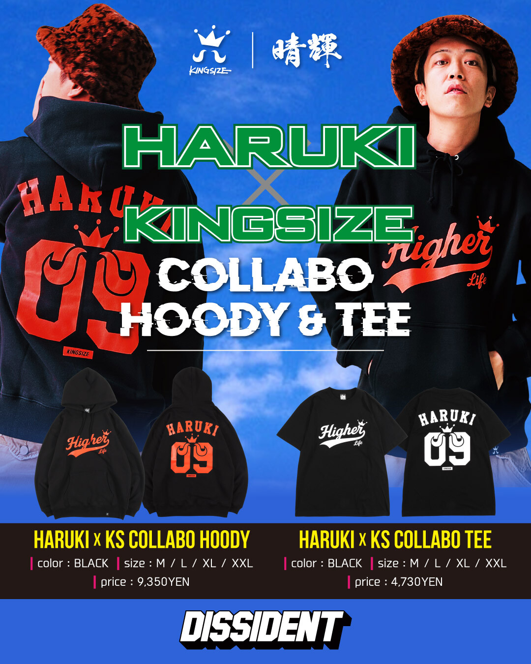 今後のDANCEHALLレゲエシーンを担うレゲエアーティスト【晴輝】とのコラボレーション。フロントに自身の楽曲【Higher】をリーグロゴで表現しKINGSIZEのロゴをかけ合わせました。バックにはアイデンティティでもある09から始まる九州の市外局番をナンバリングし、KINGSIZEのロゴをフュージョン。