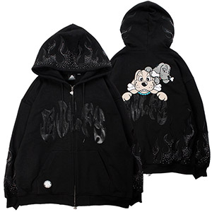 フレイム刺繍にラインストーンを配したゴージャスな仕上がりのジップパーカー。フロントにGALFYロゴ、バックにはおなじみのワンちゃんをアップリケ刺繍でオン。さらりとした風合いの裏パイル素材を使用したリラックスして着用いただけます。女性にもおすすめのユニセックスアイテムになります。