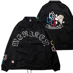 フロントにMERIKENをラインストーンで配置、バックにはおなじみのワンちゃんとマルチカラーのメリケンサックをアップリケ刺繍でオンしたナイロンコーチジャケット。袖部分にもメリケンサックを配した存在感抜群の一枚。裏地メッシュで通気性良くさらりと羽織れる使い勝手の良いアイテム。インナーのセレクトでロングシーズン重宝するユニセックスでオススメのジャケットです。