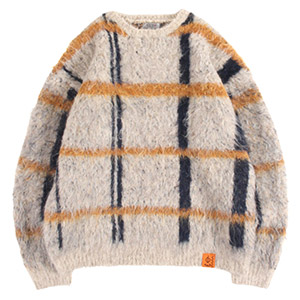 モヘアのような毛足の長い、ふんわりとした起毛感が特徴的なチェック柄のシャギーニット。しっかりとした厚みがありながらも軽やかで、肌触りもやさしい仕上がり。程よくゆったりとしたルーズシルエットで、様々なスタイリングの大活躍するアイテム。一枚でメインアイテムとして、寒い季節にはアウターのインナー使いとしても最適な一着。ノスタルジックな雰囲気漂うユニセックスでオススメニットです。