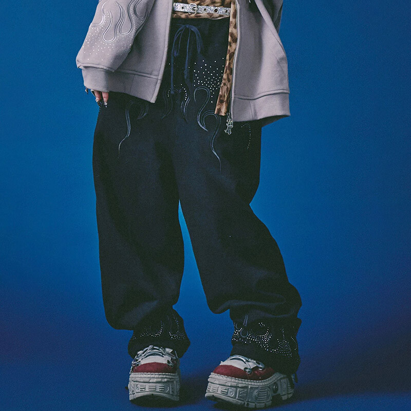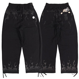 フレイム刺繍にラインストーンを配したゴージャスな仕上がりのスウェットパンツ。バックポケットから覗くおなじみのワンちゃんがキュート。さらりとした風合いの裏パイル地で吸水性もよく快適な着心地です。ゆったりとしたシルエットでリラックスして着用できる女性にもおすすめのユニセックスアイテムになります。