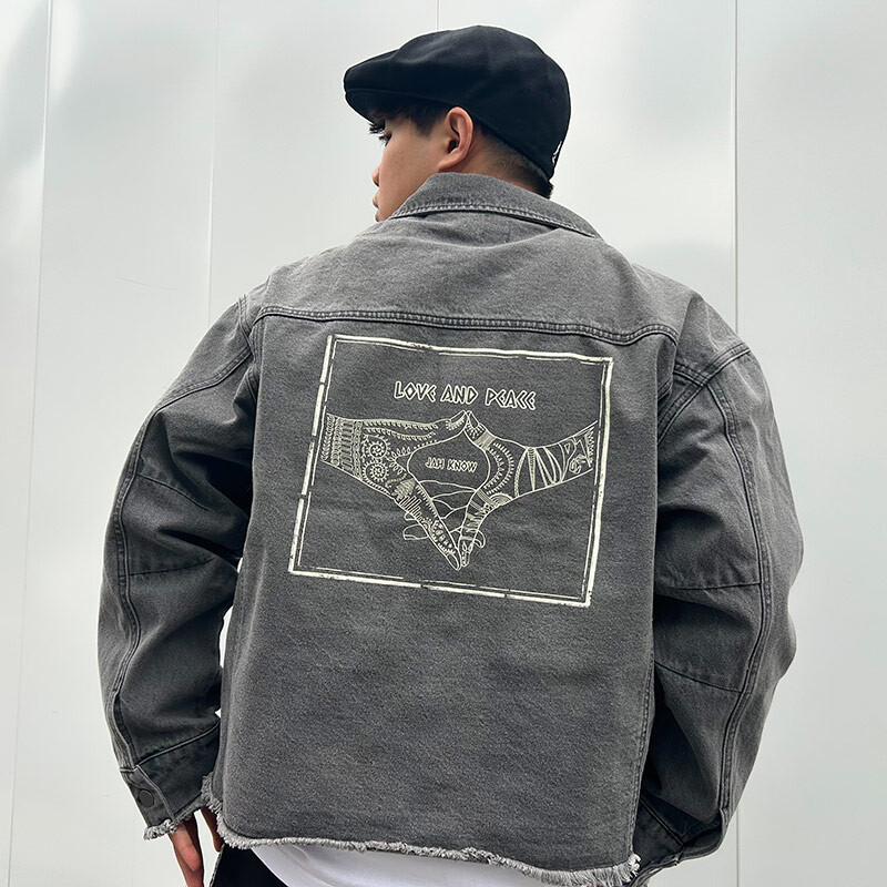 JAHを讃えるラブアンドピースでラスタなハンドサインをバックにデザインしたデニムジャケット。フロントに大きめのフラップポケットを配置したデザイン性が魅力。ヴィンテージライクな加工とエッジの効いたデザインが目を引く一着。長年着込んだようなたまらない色味と古着感をリアルに再現。袖口と裾を大胆にカットオフしたフリンジ仕様と「LOVE AND PEACE」グラフィックが、ボヘミアンかつストリートな雰囲気を醸し出しています。肩を落としたドロップショルダーと広めの身幅で、リラックスした着心地です。計算されたショート丈×ワイドシルエットが、トレンド感あるスタイルを完成させるユニセックスでオススメの一着。「ただのデニムジャケットじゃ物足りない」そんな方に手にとってほしい、ディテールにこだわったアイテムです。